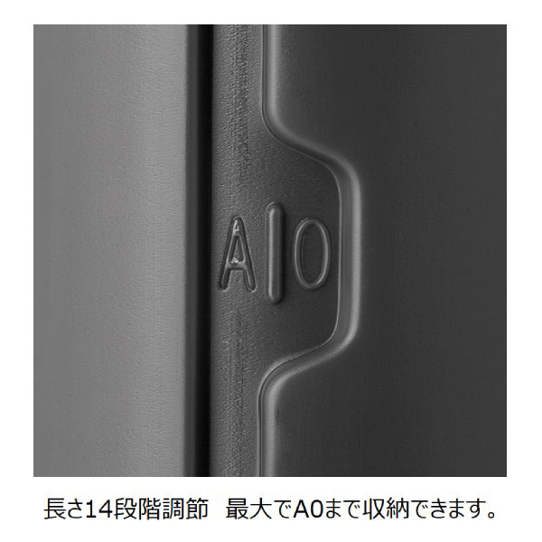 ●A0サイズ(短手)まで収容可能で、ケースの長さを590〜970mm(内径)まで14段階に調節できます。