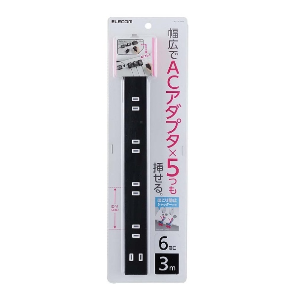 ほこり防止シャッター付きスリム電源タップ(幅広・2ピン式・6個口・ブラック・3.0m) T-NSL-2630BK