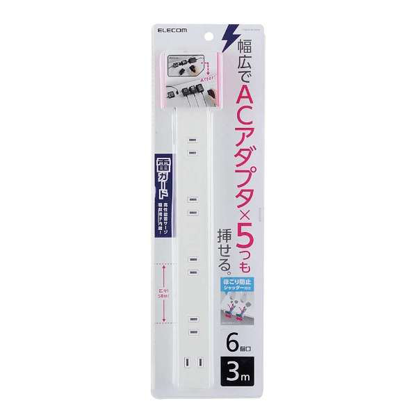 ほこり防止シャッター付き雷ガード内蔵スリム電源タップ(幅広・2ピン式・6個口・ホワイト・3.0m)T-NSLK-2630WH