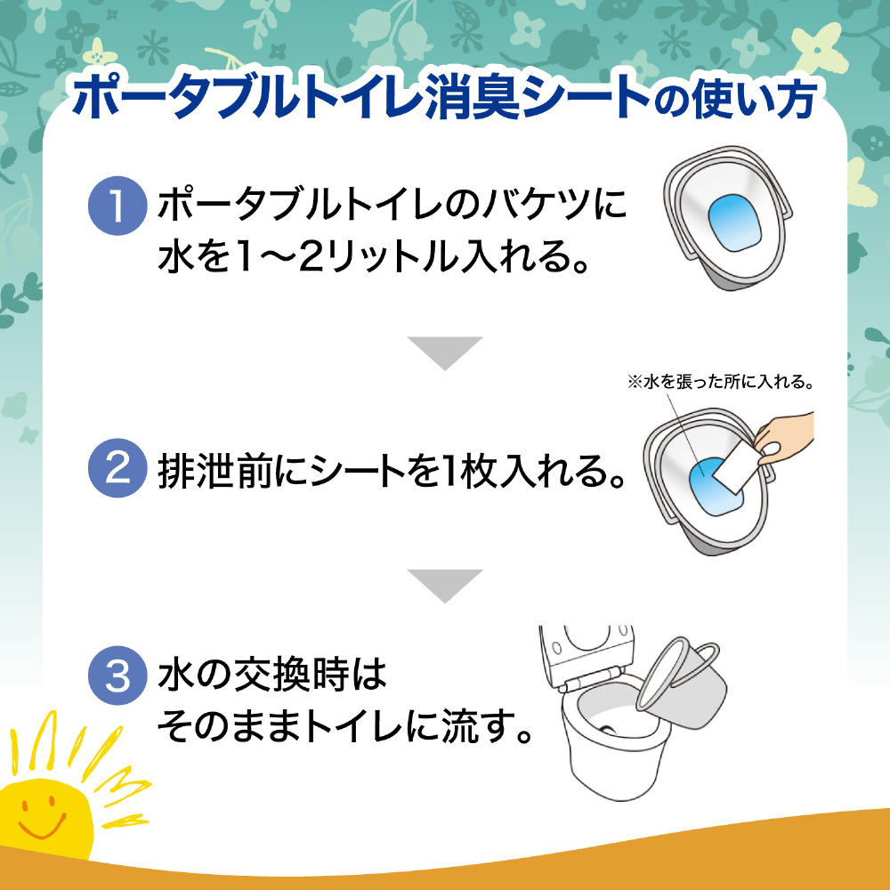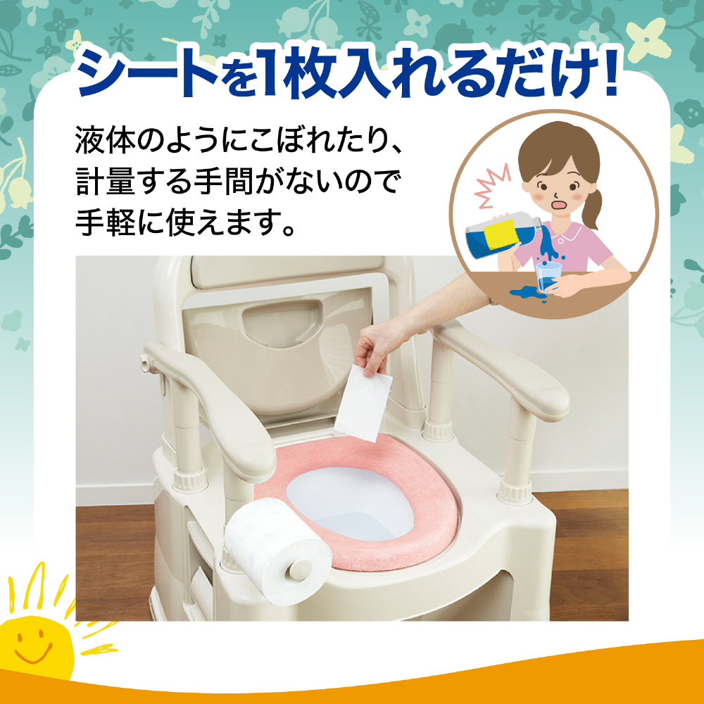 ●シートを1枚入れるだけで手軽に使えます。●ポータブルトイレの放置臭に効くクエン酸配合処方です。●水に溶けるシートなので、排泄物と一緒にトイレに流せます。※放置臭とは、尿の放置が原因で、持続的に発生するニオイ。