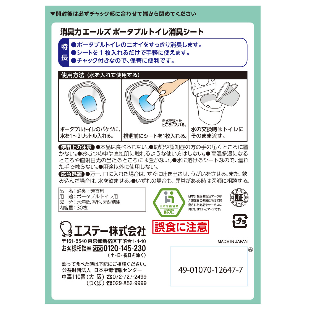 | 商品名 | エールズ介護家庭用消臭力ポータブルトイレ消臭シート30枚 |
