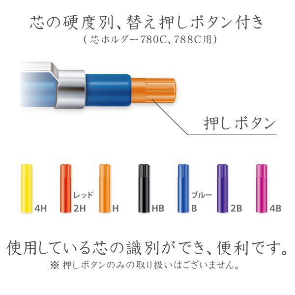 色判別用ノックパーツが付いているので芯ホルダーのキャップ部にはめ込む事で何色を使用しているか一目で判別可能になります。