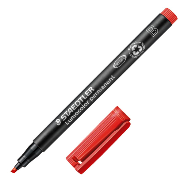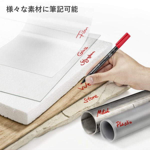 ステッドラー独自の特殊油性インクがペン先に薄い皮膜を作り、48時間もペン先の乾燥を防ぐ非常に便利な油性ペン。耐光性に優れており、屋外での使用にも最適で定着性も強いため長期間色あせせず、DVD-R、ガラス、陶器、フィルムなどなめらかな表面を持つ様々な素材に筆記可能な万能油性ペンです。・サイズ:141mm×12.8mm×9.8m ・線幅:1.0〜2.5mm ・色:赤