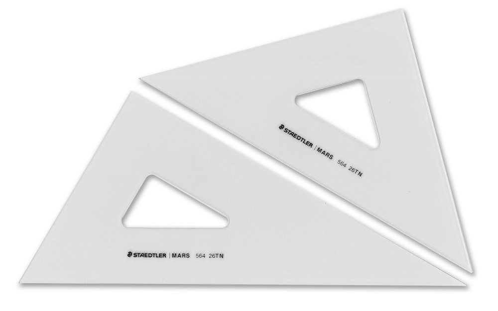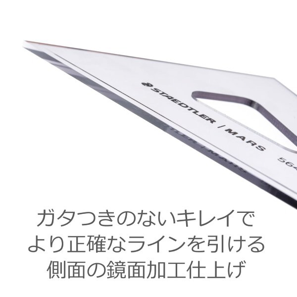 定規側面の鏡面加工でスムーズな描線をサポートする45°・60°ペアセットのアクリル製図用三角定規(26cm)。鉛筆、製図用シャープペンの他、インクエッジ付きで製図ペンも使用可能。透明度の高いアクリル製なので紙面が見やすく、強度も十分な厚さ(2.5mm)。また、筆記具の滑りが良く芯粉が出にくいので紙面が汚れにくいのも特徴。