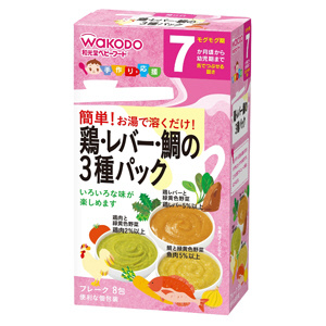 離乳食作りに便利な鶏肉、鶏レバー、鯛を使った、たんぱく素材の詰合せです。おかゆに混ぜたり、野菜を加えたりと、いろいろなメニュー作りにお使いください。