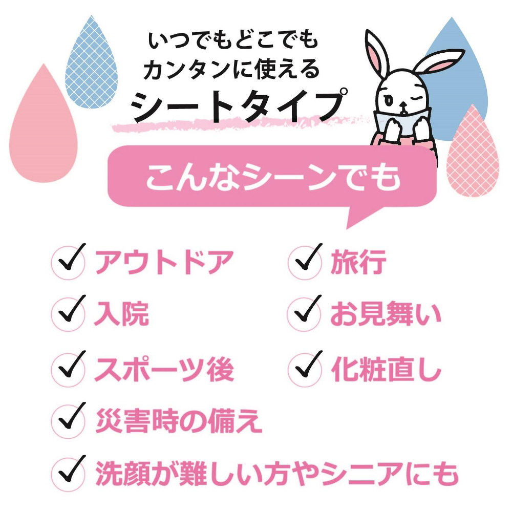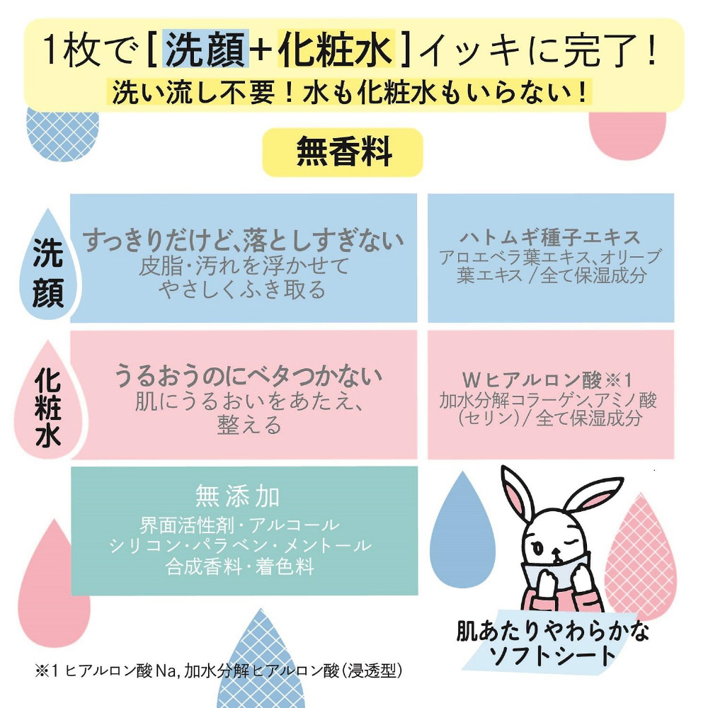 いつでも、どこでも簡単、さらに時短!ふくだけで洗顔〜化粧水がイッキに終了!すっきりだけど落としすぎない。皮脂・汚れを浮かせてやさしくふき取る。8つの無添加。アルコールフリー・界面活性剤フリー・オイルフリー・シリコンフリー・パラベンフリー、メントールフリー、無香料、無着色。