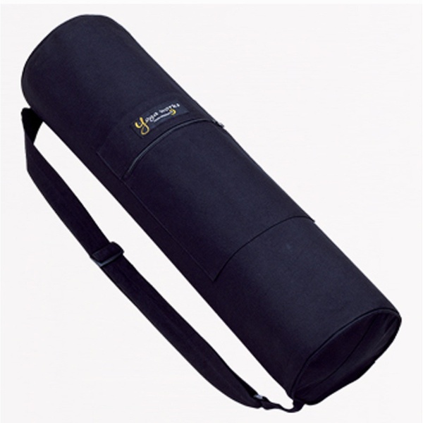 マットとラグ、ウェアなどをまとめて収納できる薄手のキャンバス生地のサイドオープンタイプのマットバッグ。正面に小物を収納できるファスナー付きのポケットがついています。ショルダーの長さを調節できるアジャスター付き。