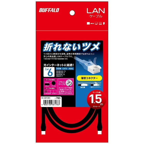 ツメの折れないLANケーブル。カテゴリー6対応。カーペットの下でも目立たないフラットタイプ。