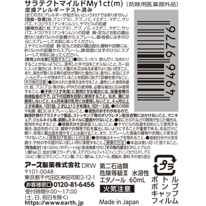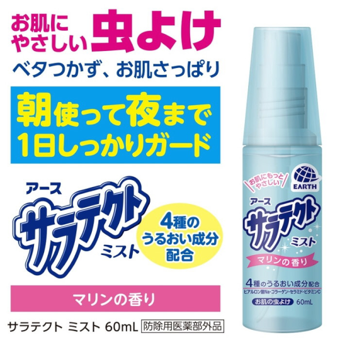 | 用法・容量 | [蚊、ブユ(ブヨ)、アブ、ノミ、イエダニ、マダニ、サシバエ、トコジラミ(ナンキンムシ)の忌避に使用する場合] 腕・足などお肌の露出部分には約15cmの距離からスプレーし、顔・首筋には手のひらにスプレーしてお肌にぬってください。 |