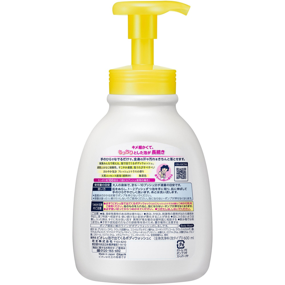 手のひら洗い派のご家族に。キメ細かくて、もっちりとした泡が長続き。手のひらでなでるだけで、全身の汗や汚れをきちんと落とせる。・家族みんなで使える、泡で出てくるボディウォッシュ。・素肌と同じ弱酸性。赤ちゃんの肌もやさしく洗える。・すこやか素肌 洗うたびすべすべ♪・SPT採用 SPT:Skin Purifying Technology・さわやか気分 フレッシュシトラスの香り・無着色