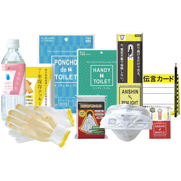 ■セット内容 ・7年保存水500? ×1 ・7年保存クッキー ×1 ・使い捨てトイレ(大小便兼用)×1 ・使い捨てトイレ(小便用)×1 ・使い捨て簡易ライト ×1 ・アルミブランケット ×1 ・緊急用ホイッスル ×1 ・軍手 ・3M社製防じんマスク ×1 ・伝言カード&ペン ×1