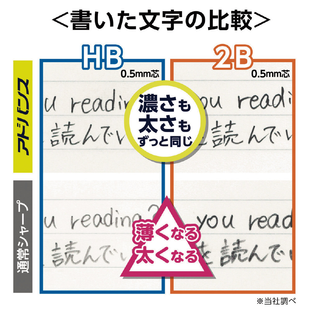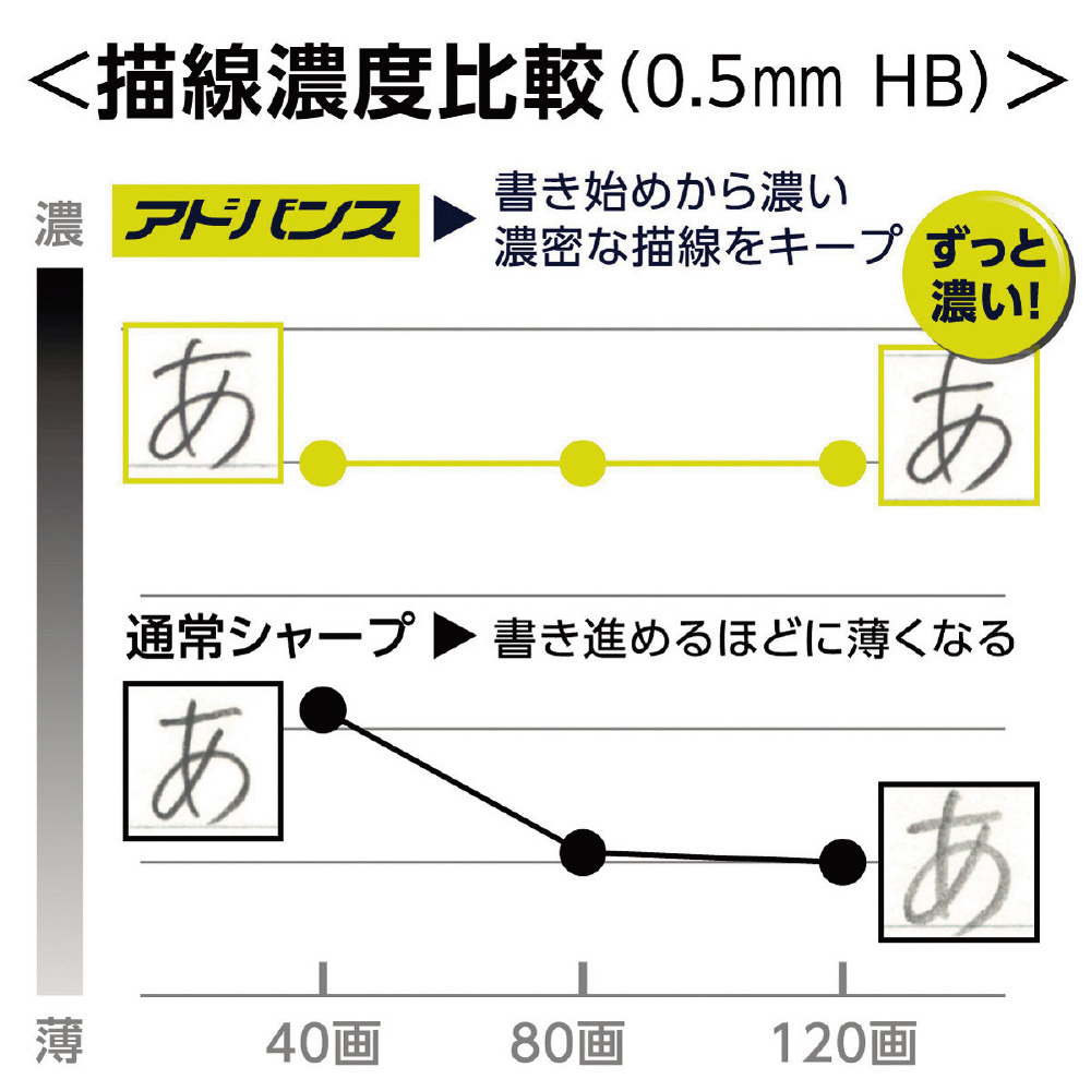 描線濃度比較(0.5mm HB) 通常シャープ: 書き進めるほどに薄くなる アドバンス: 書き始めから濃い濃密な描線をキープ ※当社調べ