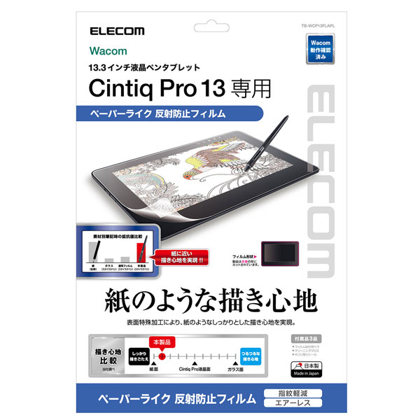 ワコム液晶ペンタブレット Cintiq Pro 13の液晶画面を傷や汚れから守る、指紋防止ペーパーライク反射防止タイプの液晶保護フィルムです。特殊表面形状デザインにより紙に鉛筆で描いたような描き心地を実現します。
