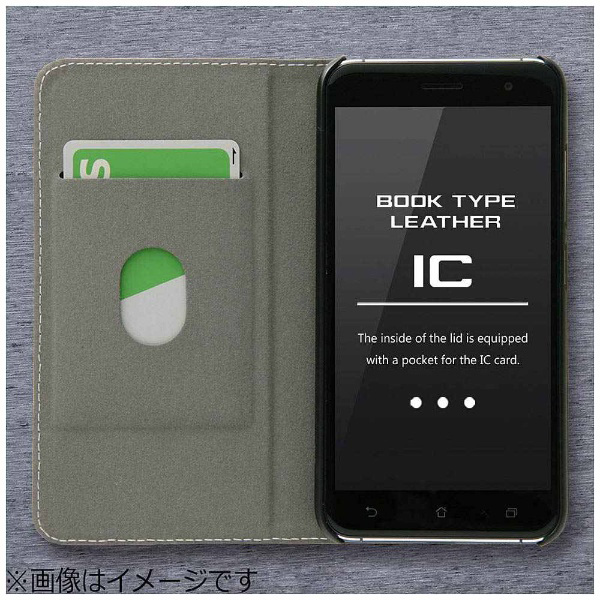 内側にはICカードポケットの付いた薄くてスリムなレザーに、キャラクターデザインがプリントされた手帳型ケース。