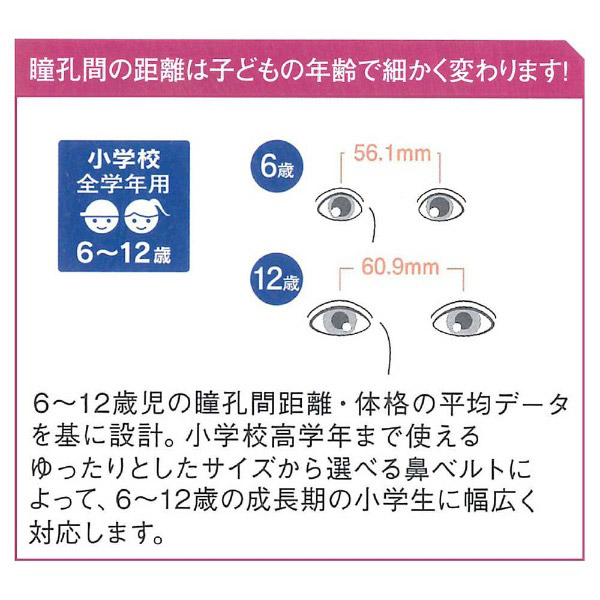 プールで映える、コンビカラーの流線型ゴーグル。4サイズから選べる鼻ベルトによって、6〜12歳の成長期の小学生に幅広く対応します。