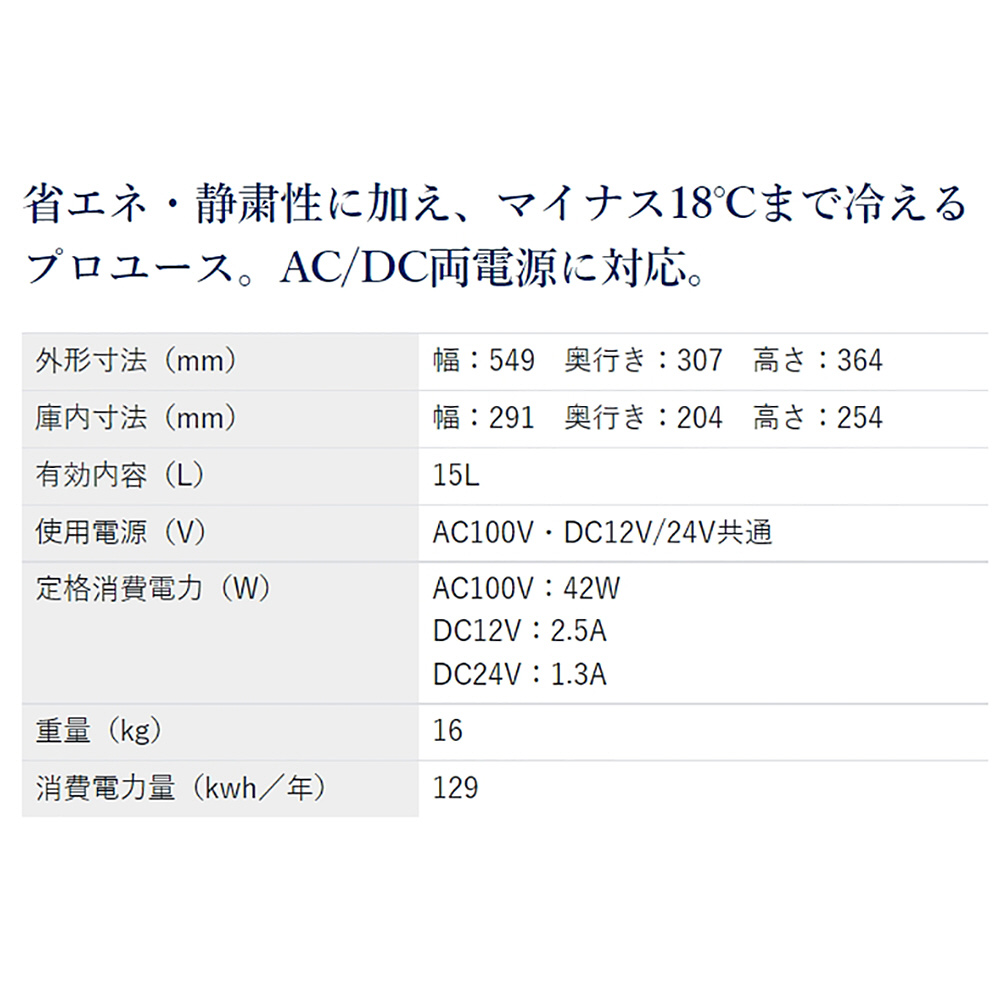 省エネ・静粛性に加え、マイナス18℃まで冷えるプロユース。AC/DC両電源に対応。