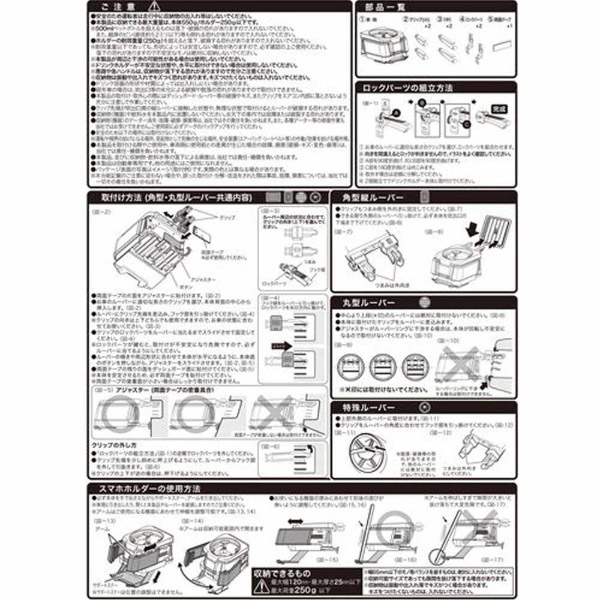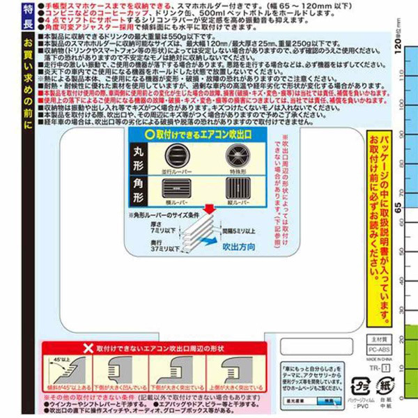 | 仕様 | ■製品サイズ:H74×W102×D117 ■パッケージ:H180×W135×D115 250g ■小箱サイズ:H200×W640×D485/20個入 ■外箱サイズ:H430×W660×D505/40個入 ■スマートフォン収納サイズ:65〜120mm ■厚み:25mmまで ■重量:250gまで ■JAN:4974267022036 |