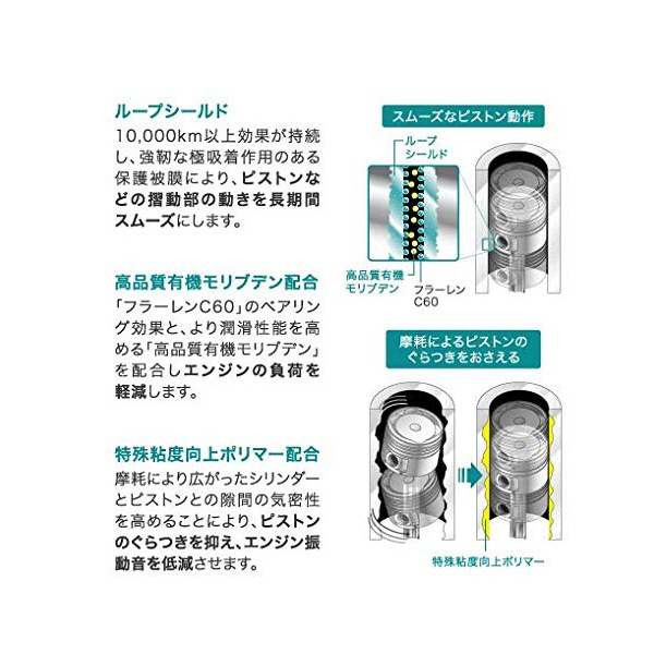 洗浄力を向上させた特殊洗浄成分を配合し、オイル交換や短時間のフラッシングでは落とせないエンジン内部の汚れを走行しながらじっくり落とし、オイル交換予定の3000〜5000km前に注入することで洗浄効果を発揮します。さらに、コーティング効果が高まった1万キロ以上効果が持続する“ループシールド”を採用しました。