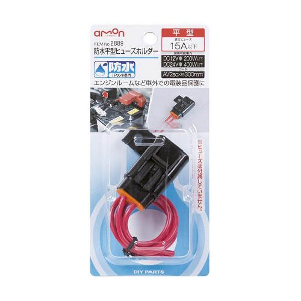 ■しっかりと取り付けができる固定穴付き 【仕様】・使用可能電力:DC12V車/200W以下 DC24V車/400W以下・防水性能:IPX4 相当・コードサイズ:AV2sq×約300mm・平型ヒューズ専用※ヒューズは付属していません【内容物】・防水平型ヒューズホルダー:1個