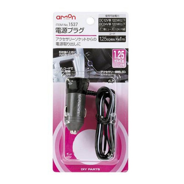 ■インジケータLED付き 【仕様】・使用可能電力:DC12V車/120W以下 DC24V車/120W以下・コードサイズ:1.25sq相当×約1m・ミニ管ヒューズ(10A)内蔵・アクセサリー照明LED(青)付 【内容物】・電源プラグ(1.25sqコード付き):1個