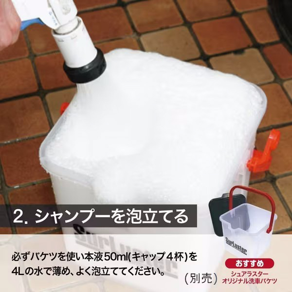 1.ボディに水をかけ傷の原因となる砂・埃等を流してください。2.必ずバケツを使い本液50ml(キャップ約4杯)を4Lの水でうすめ、良く泡立たせてください。3.洗車用スポンジにシャンプーを含ませてからやさしくボディをこするように洗車してください。4.速やかにシャンプー液を十分な水で流し、水滴が残らないようにきれいなタオル等でふき取ってください。※水滴が残ると、ウォータースポット等の原因になりますので注意してください。※液剤がついた状態で乾くとシミの原因になることがあります。 5.使用後は手をよく水で洗ってください。