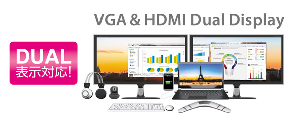 ドッキングステーションブーメランがDUALディスプレイ対応となって新登場![USB3.0×4、HDMI、VGA、gigabitイーサネット、スピーカー、マイクポート]