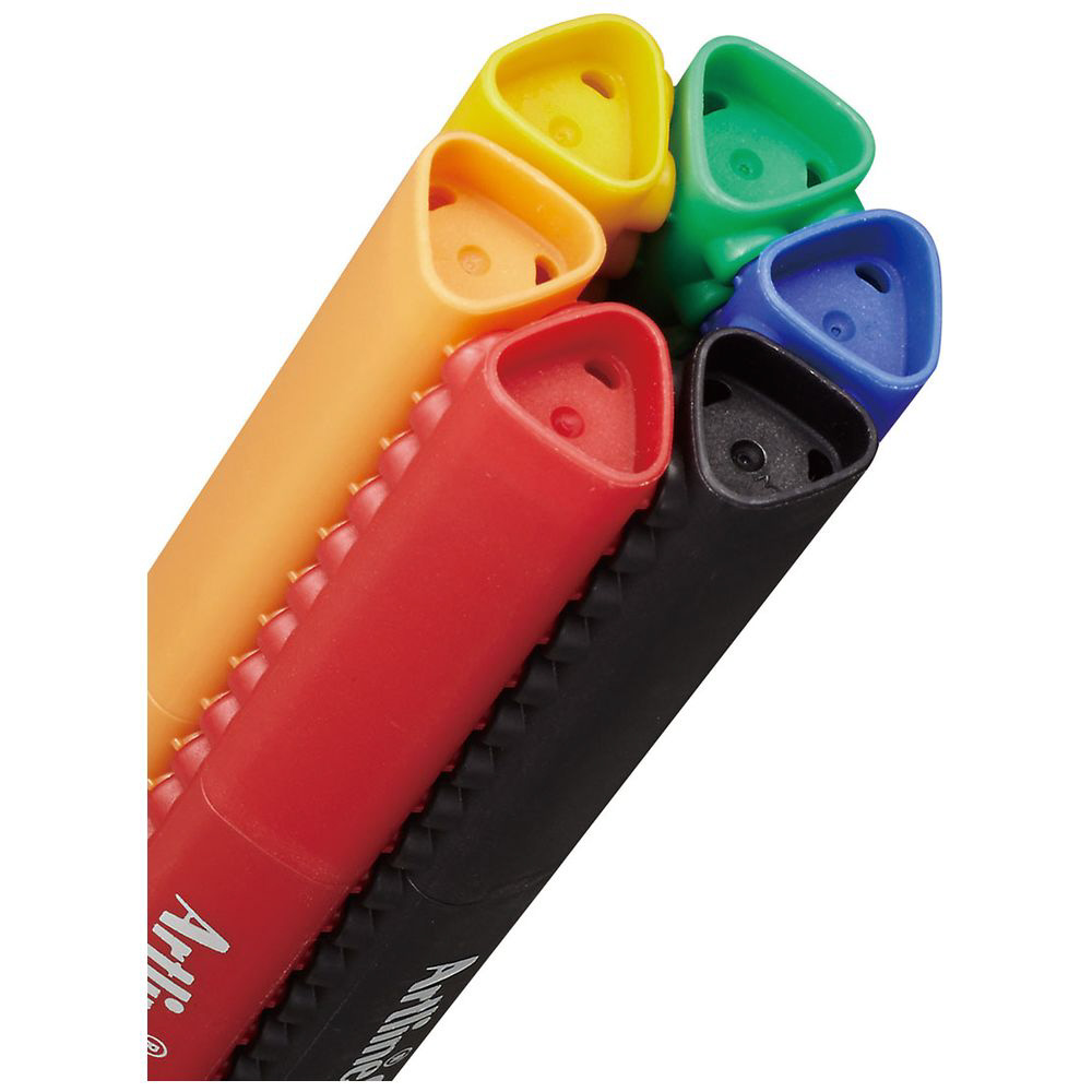 ・三角形のボディーの2側面に凹凸パターンが付いた連結式筆記具。凹面と凸面をつなぎあわせることができ、よく使う筆記具をコンパクトにまとめて持ち歩けます。