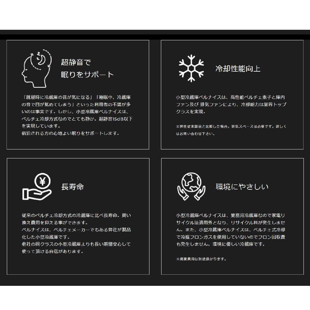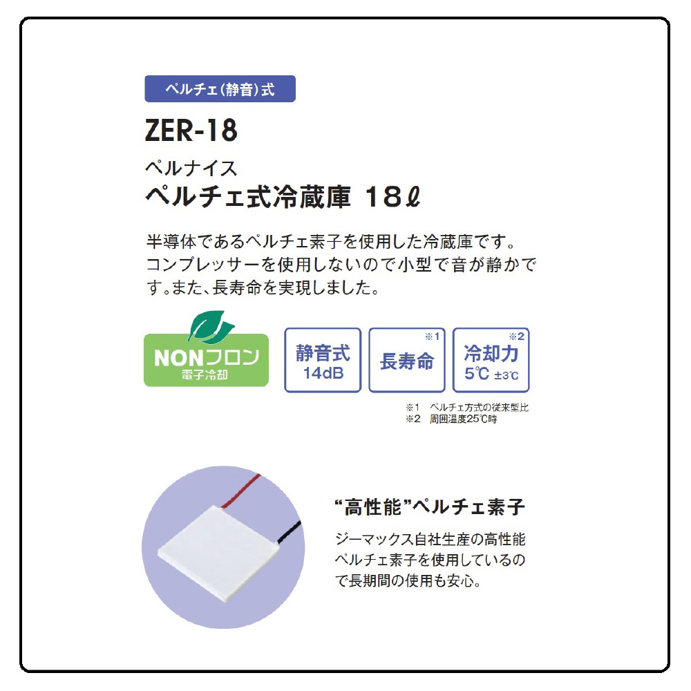 ガスを使用しないペルチェ式冷却で環境に優しい冷蔵庫です。