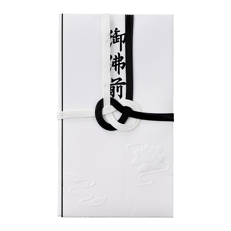 仏式法要・法事の金包みとして最適な金封です。蓮葉が金封本体に型押しされたタイプです。「御佛前」が墨色で印刷されています。一般的に49日から「御佛前」を使用します。