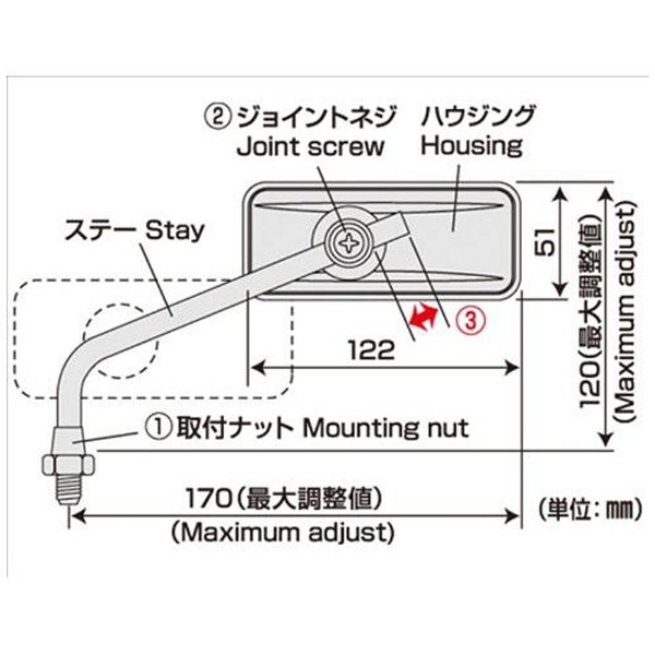 AVA-101-10 バイクミラー ナポレオン(NAPOLEON) リトラミラー(左右共通)カラー:クロームメッキ 10mm ネジ径変換アダプター付/1本入り
