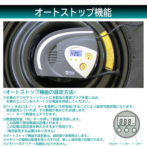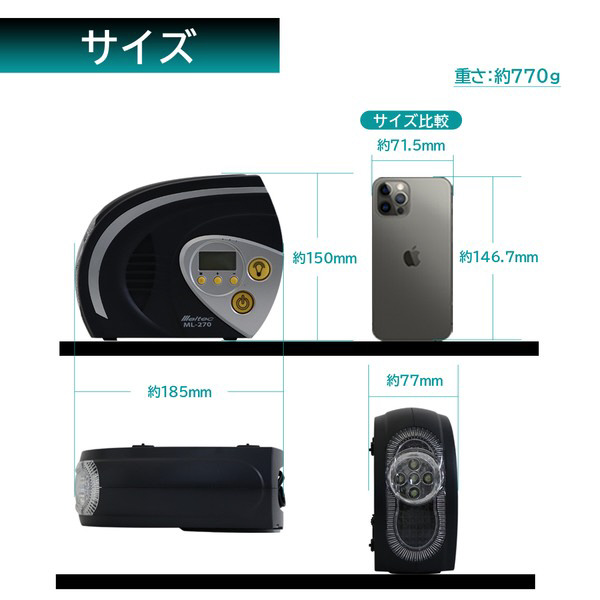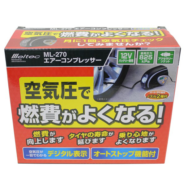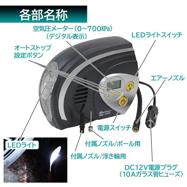 エアーコンプレッサー 一目でわかるデジタル表示 オートストップ機能、LEDライト付 DC12V用 ML-270