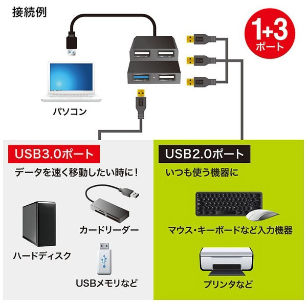 ■USB3.0×1ポート、USB2.0×3ポートのコンボハブです。