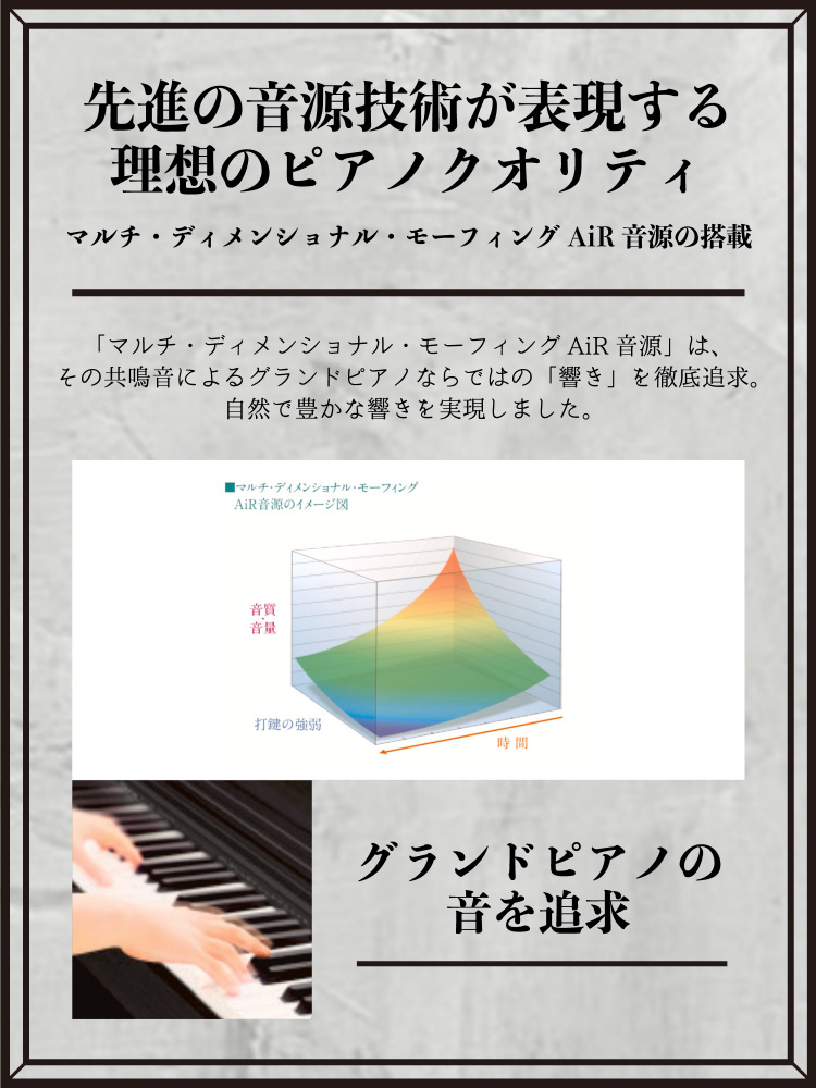 打鍵の強弱に応じた音量・音色の変化に加えて、音の時間的な変化までも自然に表現する「マルチ・ディメンショナル・モーフィングAiR音源」を搭載。発音から美しく伸びてゆき、やがて消音するまでの音の変化を、音量・音質の変化も含め境目なくなめらかに表現します。さらに、打鍵の強弱に応じた余韻の長さもコントロール可能です。今回、時間経過に伴う音質の変化を従来機種よりもきめ細かく制御することで、より伸びのあるサウンドを追求しました。