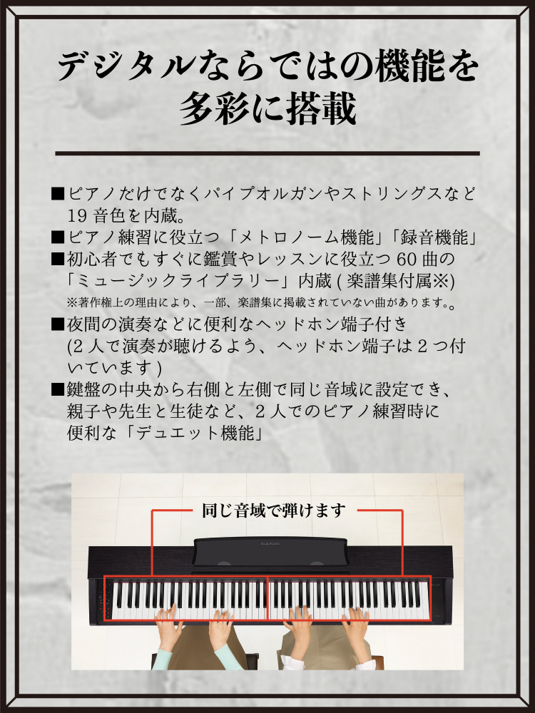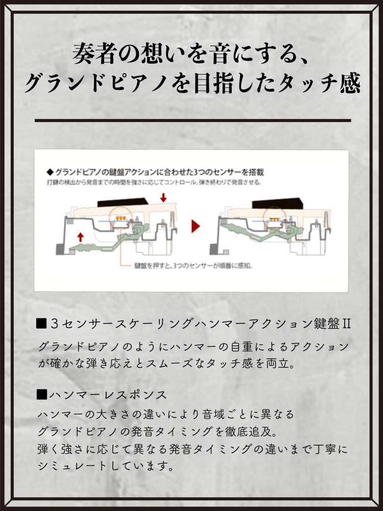 ・優れた同音連打性などを実現する、3つのセンサーを搭載。・高級感を感じさせる質感と、なめらかな手触りを実現した象牙調・黒檀調鍵盤。・ピアノ音色ごとの特長に合わせた発音タイミングや、音域ごとの発音タイミングの違いを表現するハンマーレスポンス。