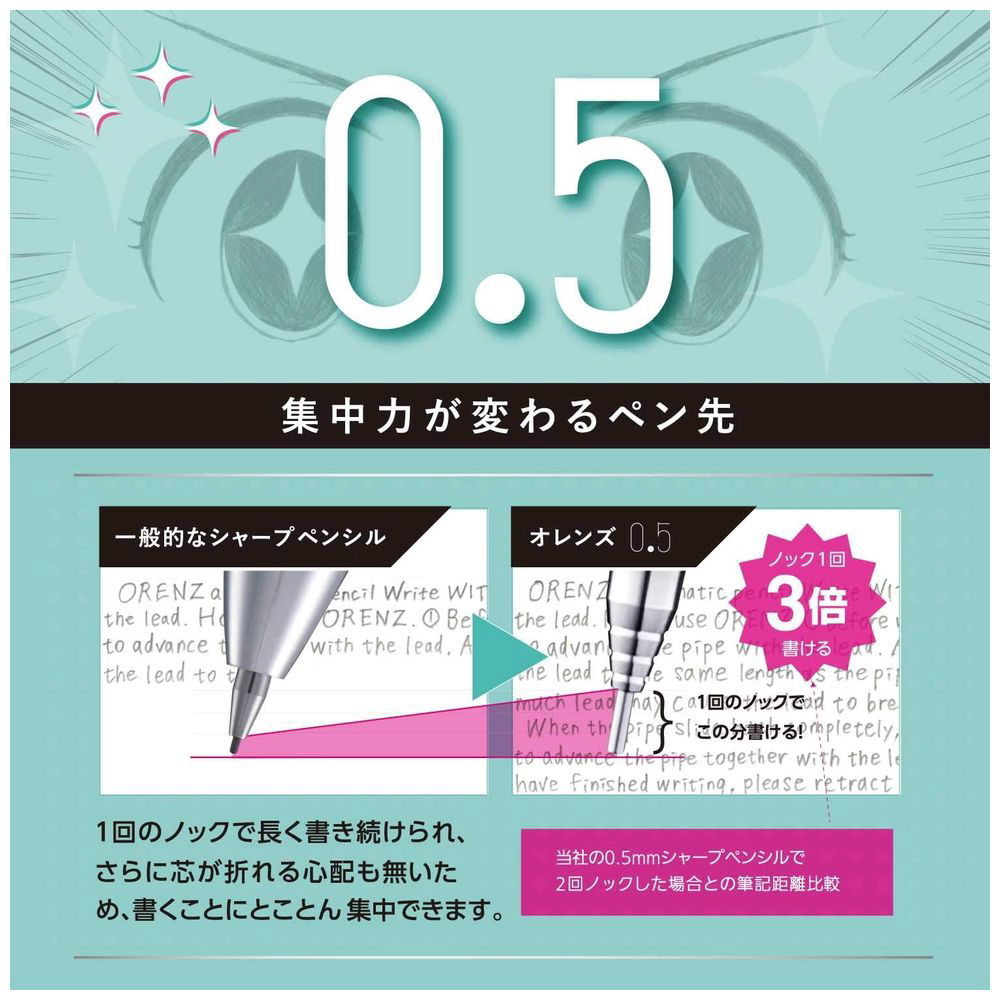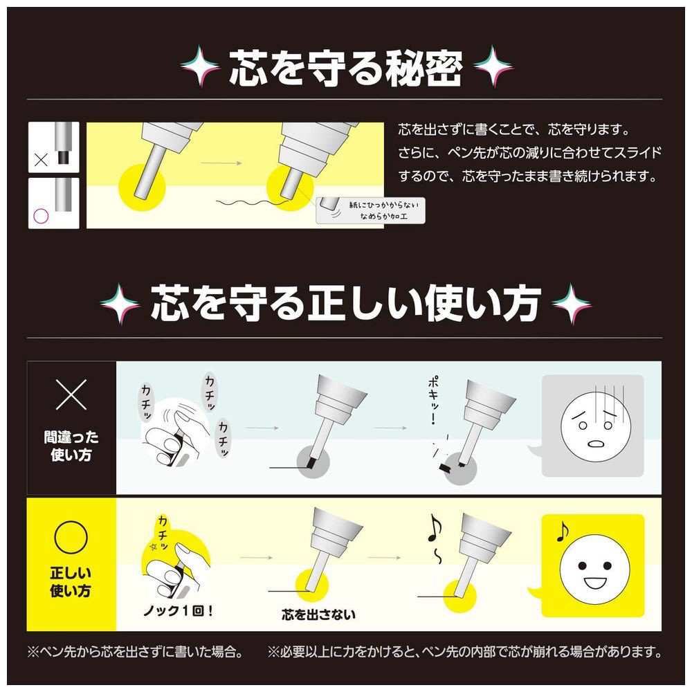 先端パイプの分だけ長くかけるから、ノック1回の筆記量が一般的なシャープペンシルの3倍です。