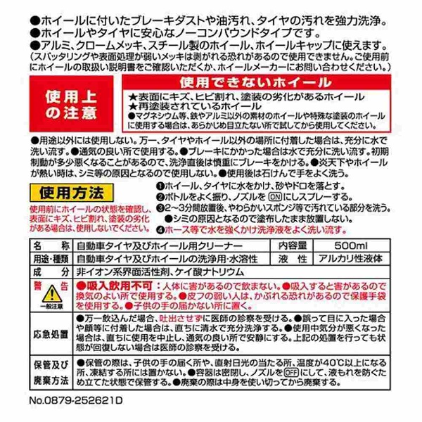 アルミホイールはもちろんスチールホイールやホイールキャップも強力洗浄。水洗いでは落ちないタイヤの汚れも洗浄できます。マグナショットノズルで汚れを狙い撃ち!内容量500ml。
