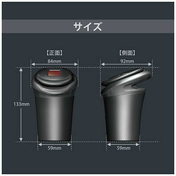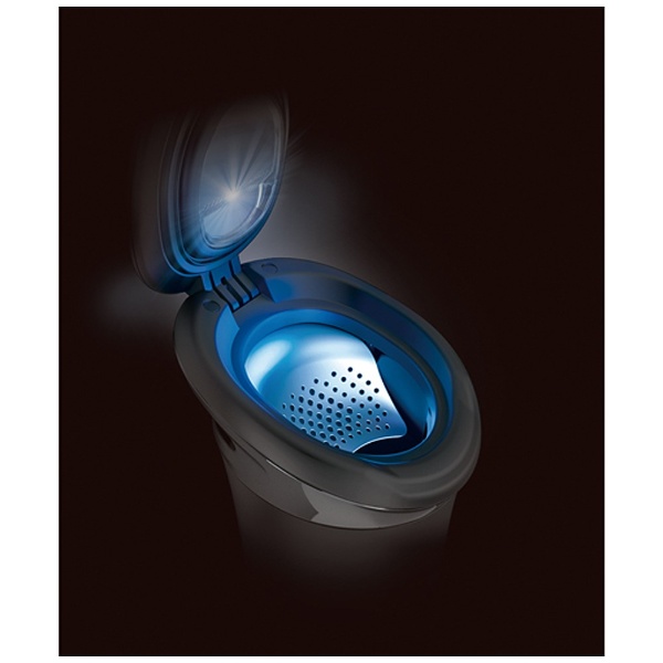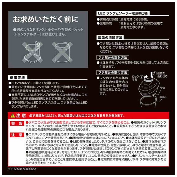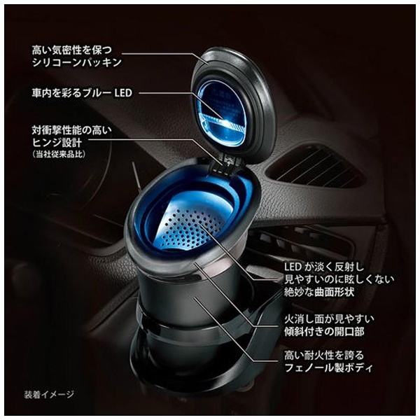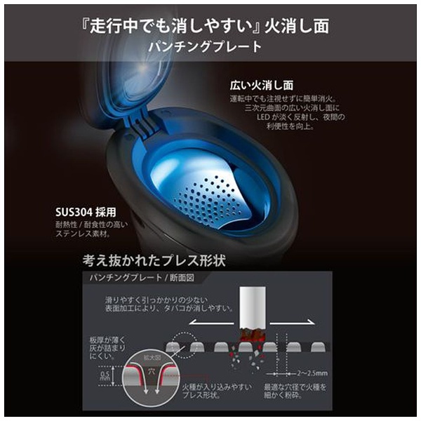 走行中でも消しやすいステンレスパンチングプレートの火消し面。フタには高い気密性を保つシリコーンパッキン付き。車内を彩るブルーLED付き(ソーラー充電式)。高い耐火性を誇るフェノールボディ。