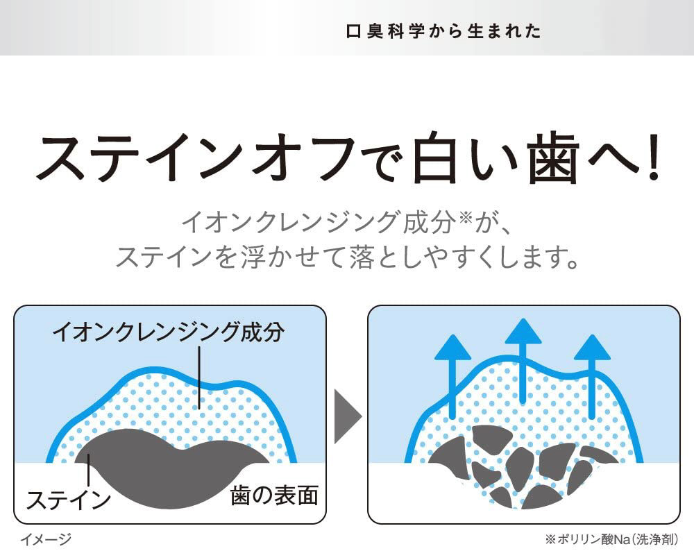 口臭にトリプルアクション 1.口臭原因菌のかたまりを分散*1 2.口臭原因菌を徹底殺菌*2 3.ブレスリフレッシュ*3、、、CLEARBREATH、STAIN OFF クリアな息をキープステインオフで白い歯へ天然ミント配合 フルーティでやさしいピュアリーミント香味歯科医院で歯の定期健診を受けましょう。