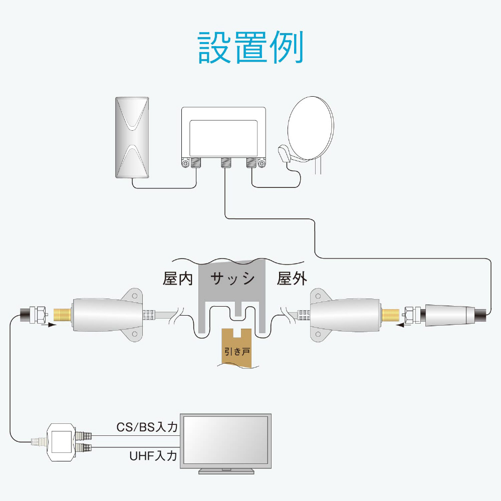 既存の2K放送から4K・8K(3224MHz)放送まで対応した製品です。屋外に設置したアンテナからの電波をサッシ戸から屋内に引き込むことができます。他の無線サービスとの電波干渉を押さえる高シールド設計。