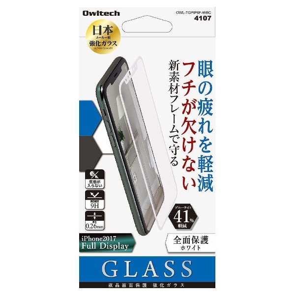 【在庫限り】 iPhone X用 液晶保護ガラス 全面保護 ブルーライトカット41% PET素材フレーム 0.26mm ホワイト OWL-TGPIP8F-WBC