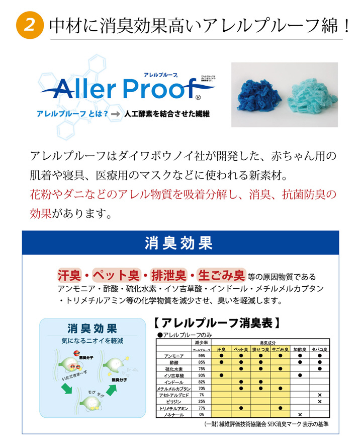 アレルプルーフの特長として1.アレル物質を吸着、ダニの死骸や糞・花粉等のアレル物質を繊維上で吸着します。2.抗菌防臭、繊維上の黄色ブドウ球菌の増殖を抑制します。