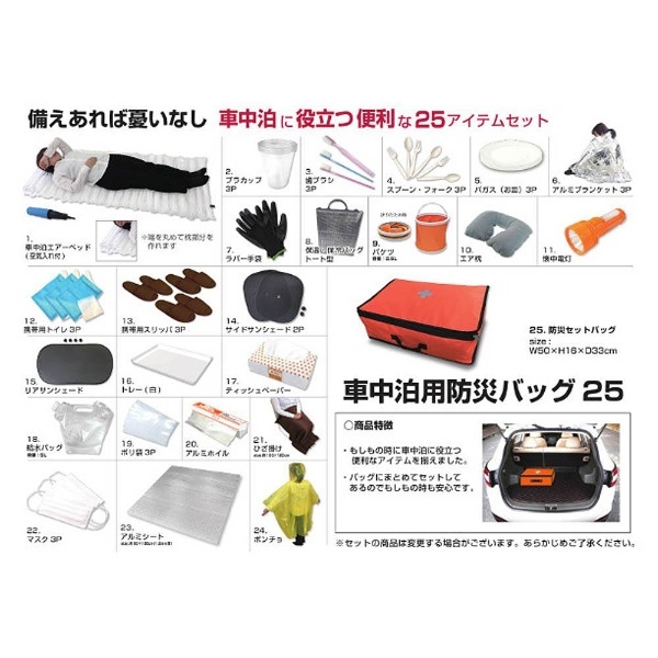 備えあれば憂いなし 非常時や災害時の車中泊に役に立つ便利な25アイテムセット