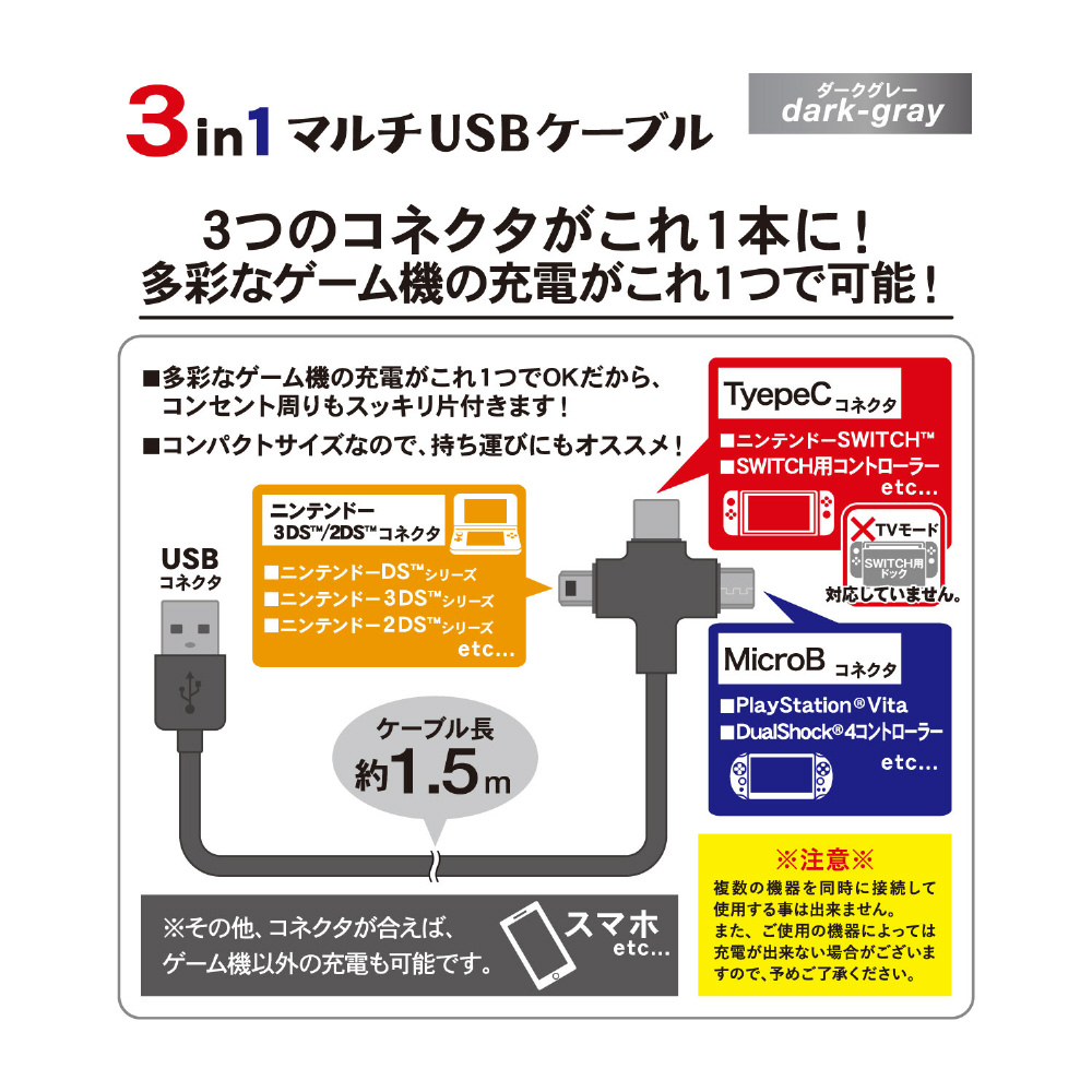多彩なゲーム機の充電がこれ1つで可能。ケーブル長 1.5m