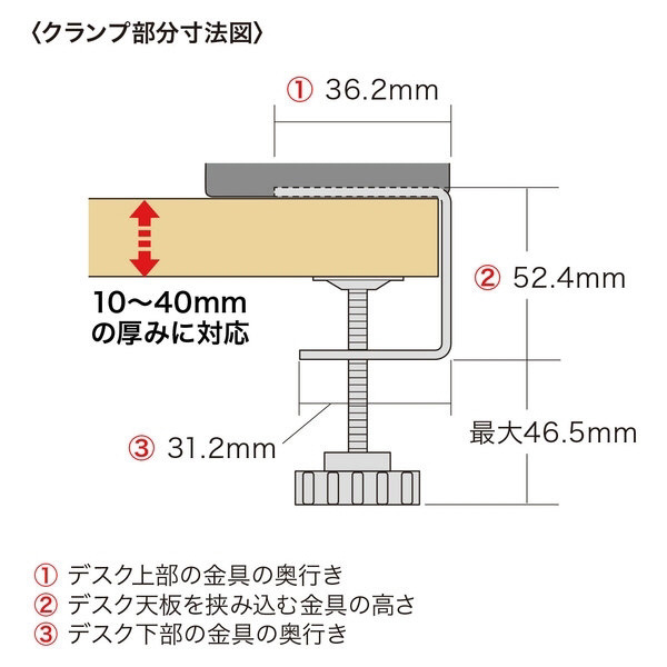■クランプ対応厚: 天板の厚みが10〜40mmまで