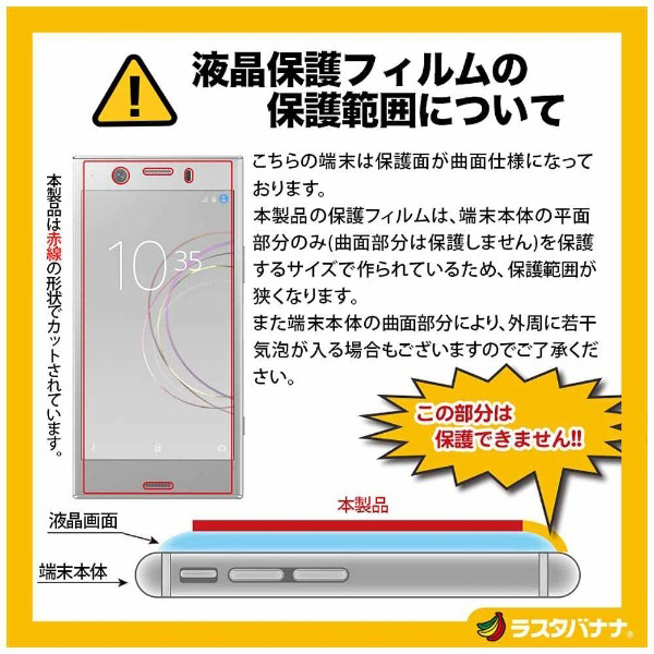 本製品の形状は、端末本体の平面部分のみを保護するサイズで作られています。 また機器本体の構造上、外周に若干気泡が入る場合があります。 端末によっては曲面部分が広範囲にわたる為、保護箇所が著しく狭まることがあります。 こちらの仕様をご理解いただいた上でご購入いただきますようお願いいたします。