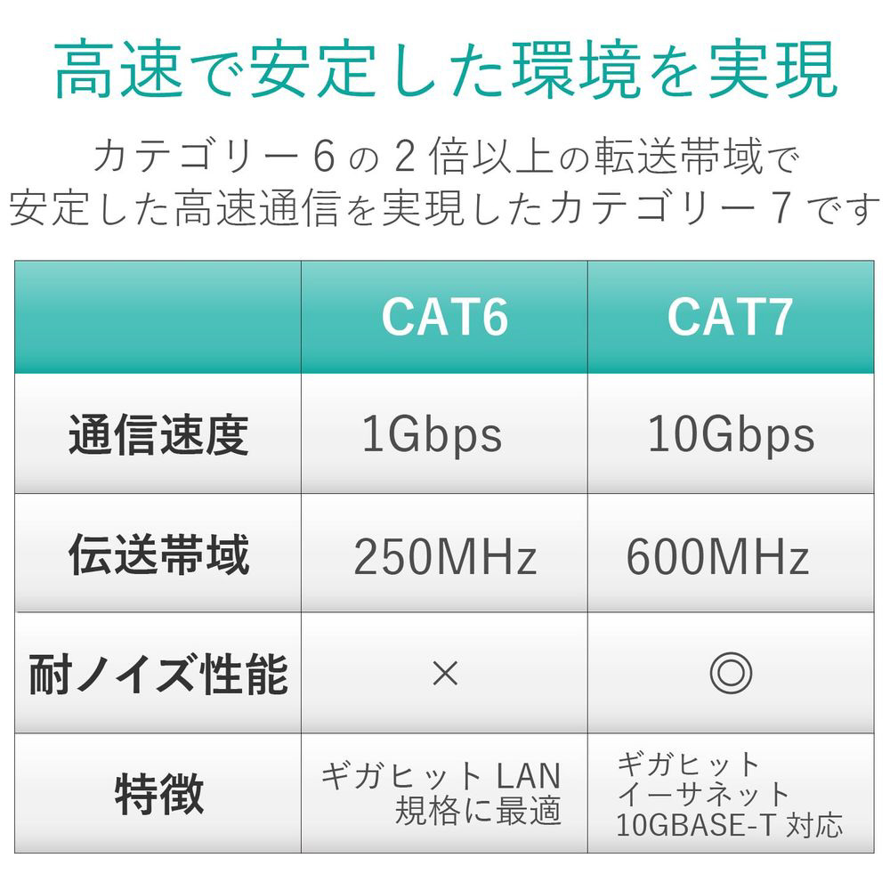 ■カテゴリー6の2倍以上である600MHzまでの高周波帯域まで対応しており、ノイズ干渉にも強く、高速で安定したネットワーク環境を実現します。