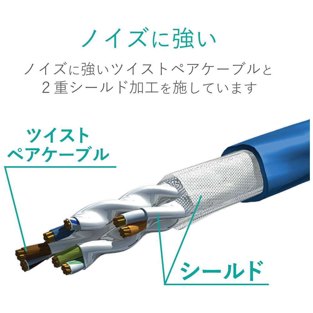 ■ギガビット以上の高速通信で起こりがちな、隣り合ったケーブル間でのノイズ干渉による通信エラー(エイリアンクロストーク)を防ぐ二重シールド構造を採用しています。