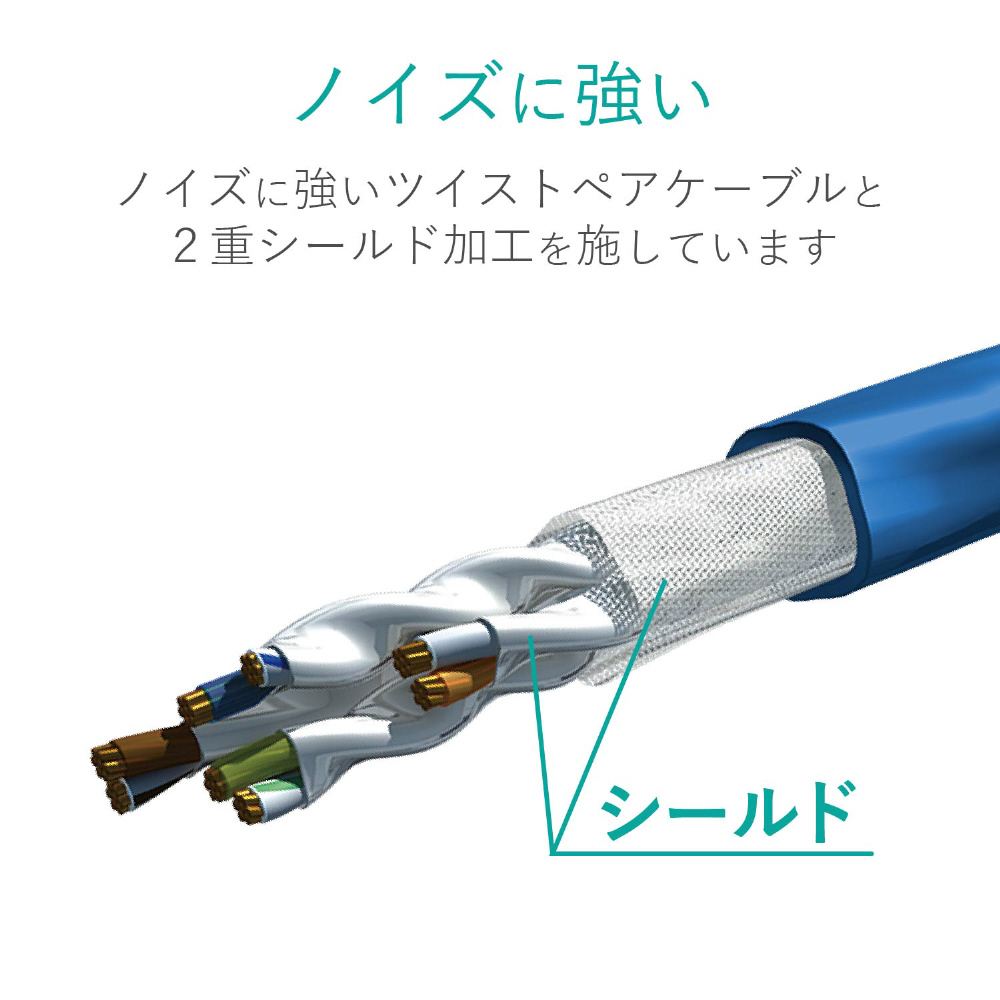 ■ギガビット以上の高速通信で起こりがちな、隣り合ったケーブル間でのノイズ干渉による通信エラー(エイリアンクロストーク)を防ぐ二重シールド構造を採用しています。