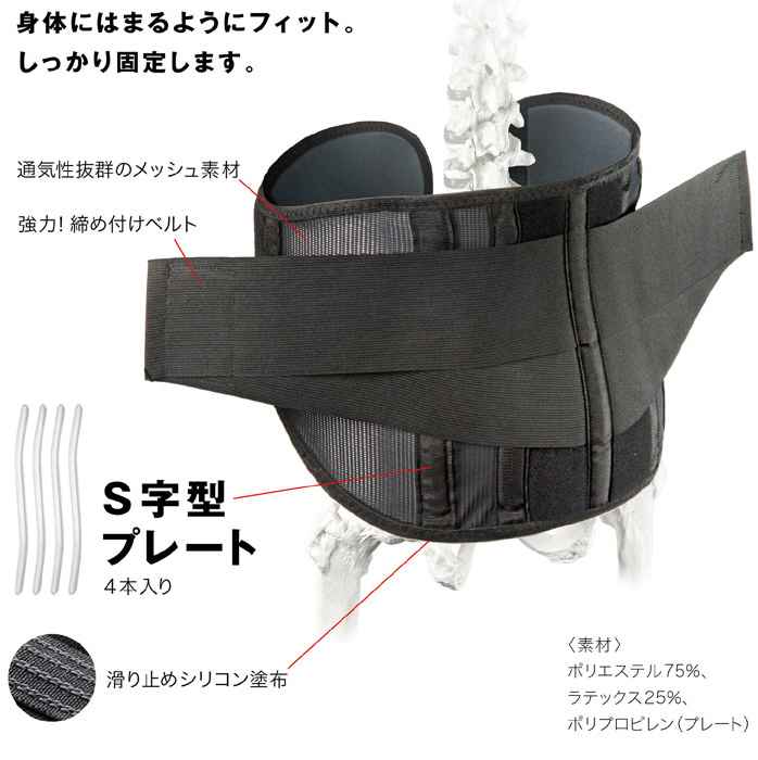 通気性抜群のメッシュ素材に強力な締め付けベルト仕様。S字型プレートが4本入っており、滑り止めシリコンも塗布されています。
