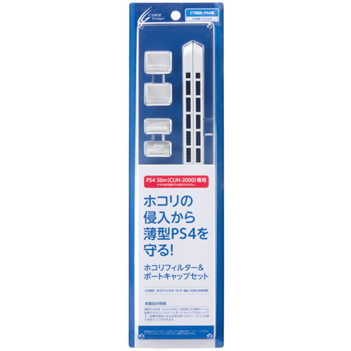 PS4本体側面に装着して通気口からのホコリの侵入を防ぐフィルターと、PS4本体の使用していない端子をカバーするシリコン製ポートキャップのセットです。